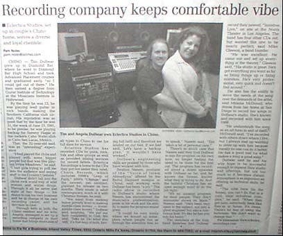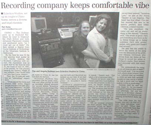 Eclectica Studios - L A Times April 24,2002 April 24, 2002 CHINO Recording company keeps comfortable vibe By Pam Noles / pam.noles@latimes.com CHINO -- Tim Dolbear grew up in Diamond Bar, where he went to Diamond Bar High School and took Advanced Placement courses and graduated early "so I could get out of there.' He then earned a degree from Guitar Institute of Technology at the Musicians Institute in Hollywood. By the time he was 15, he was playing lead guitar in rock bands, making the Southern California club circuit. His reputation was so good that by the time he was 21, the week of June 13, 1991, to be precise, he was playing backup for Sammy Hagar at the rocker's Cabo Wabo club in Cabo San Lucas, Mexico. That, the 32-year-old said, was an "interesting" experience. "I had played the clubs and played with some bigger people but that was like playing Irvine Meadows," he said. "I had girls trying to pull me into the audience and saying stuff to me I couldn't believe. " Dolbear didn't fall into the cliché rock world trap of wild women and wilder drugs. Through it all he never lost sight of two things -- his desire to run his own business and be in charge of his own recording career, and his devotion to God. Through faith in both, the Chino resident and his wife, Angela, managed to set up a recording company in their home that brings musicians of all types to Chino to use his full slate for service. Eclectica Studios has recorded CDs by punk, rock, folk and other groups as well as provided mixing services for record labels. Eclectica Recordings is home to the CDs they put out under their label, Charis Records, which includes 1998's "Leap of Faith," 2000's "Change" and the newest, yet untitled, planned for release in two months. Their music is adult contemporary, much of it with Christian themes, he said. "We went from making below poverty level to making middle-class money -- lower- middle-class money," Dolbear said, laughing. "We put our faith completely in God. We said, 'Take us. Do what you will.' It's that leap of faith, having full faith and therefore we landed on our feet. If we had said, 'Let's have a backup plan,' it wouldn't have worked." Dolbear's engineering skills are praised by those who have worked with him. Ibrahim Naeem, producer of the "Voice of Islam Ahmadiyya" offered by the Baitul Hameed mosque in Chino, said working with Dolbear has been "a joy." The radio show is recorded in Dolbear's studio where Naeem has encountered the musician's professionalism, pride in his work and his ability to make the program sound great. "It could be very easily where we wound up someplace where people run us through the assembly line, so to speak," Naeem said. "Tim takes a lot of personal care." There's so much care that Naeem said they trust Dolbear to mix the program on his own now, no longer feeling the need to be there for the first cut. The program has recorded about a dozen episodes with Dolbear so far, and he knows the format, knows what they're trying to do. And the faithful Christian has an open enough mind to do the job right. "It's an unusual program for most people. They don't encounter shows on Islam," Naeem said. "He's been very open to the subject, not only a great engineer but also a marvelous host. It's like he has you into his home." The members of the Irish band Innisfree had Dolbear record their newest, "Innisfree Live," on site at the Norris Theater in Los Angeles. The band has four other CDs out, but wanted this one to be nearly perfect, said Mike Gleeson, a band founder. "He was excellent. He came out and set up everything at the theater," Gleeson said. "His studio is great. He's got everything you want as far as fixing things up or fixing mistakes. He's very professional, very quick and doesn't fool around." He also has the ability to serve the needs of the song over the demands of the artist, said Meleisa McDonell, who drives from her home in San Diego to record her songs in Dolbear's studio. She's known and recorded with him since 1988. "He understands the song as an art form in and of itself," McDonell said. "I've recorded with others down where I live, but I always end up wanting to drive up with him because frankly no one can do it better. He has a good feel for what makes a song a good song." Dolbear said he and his wife hope to be successful enough to expand their studio and offerings, but not too much so it becomes distant. Atmosphere is as important an offering as technical skills, he said. "The vibe here [in the house], you can't do that in a cold, stale industrial complex," he said. "When they get here, everybody feels like they're at home. It's clean. There's no fear of using the bathroom. We don't want to change that." For information: www.eclecticarecordings.com/